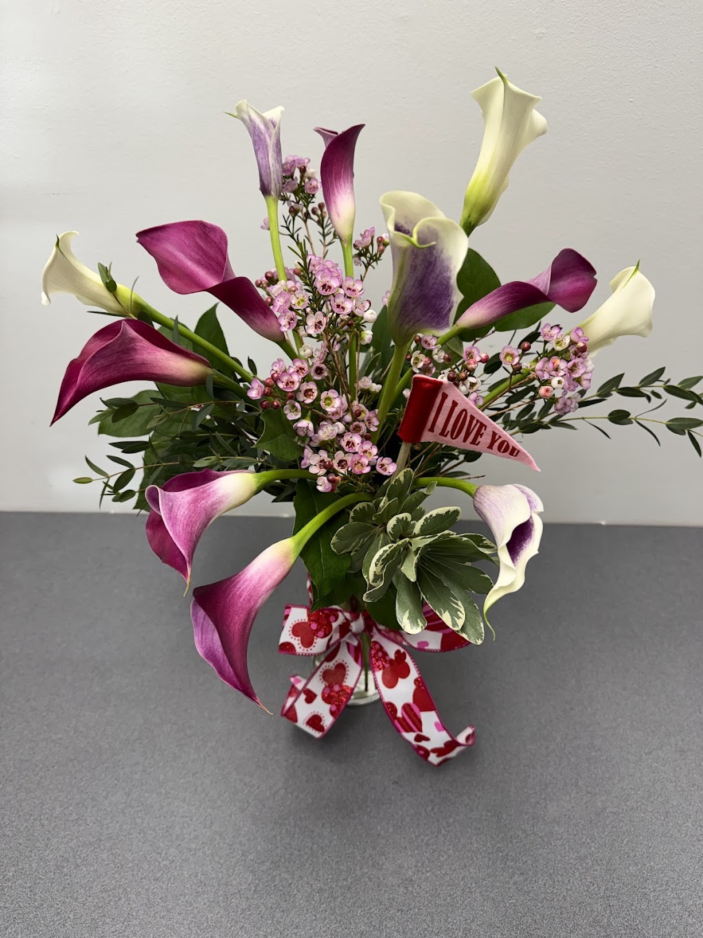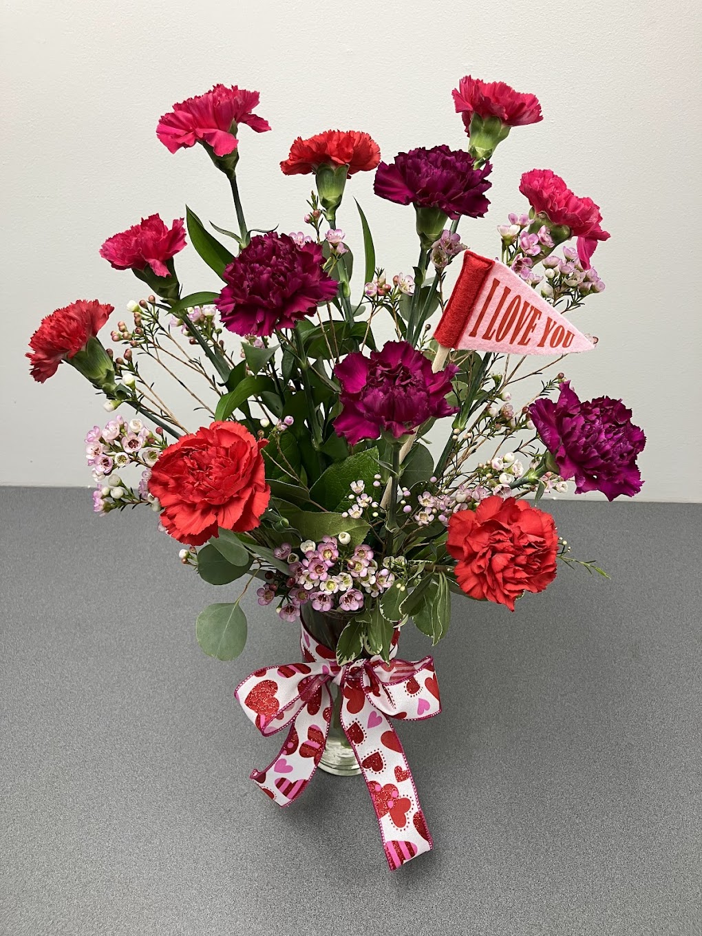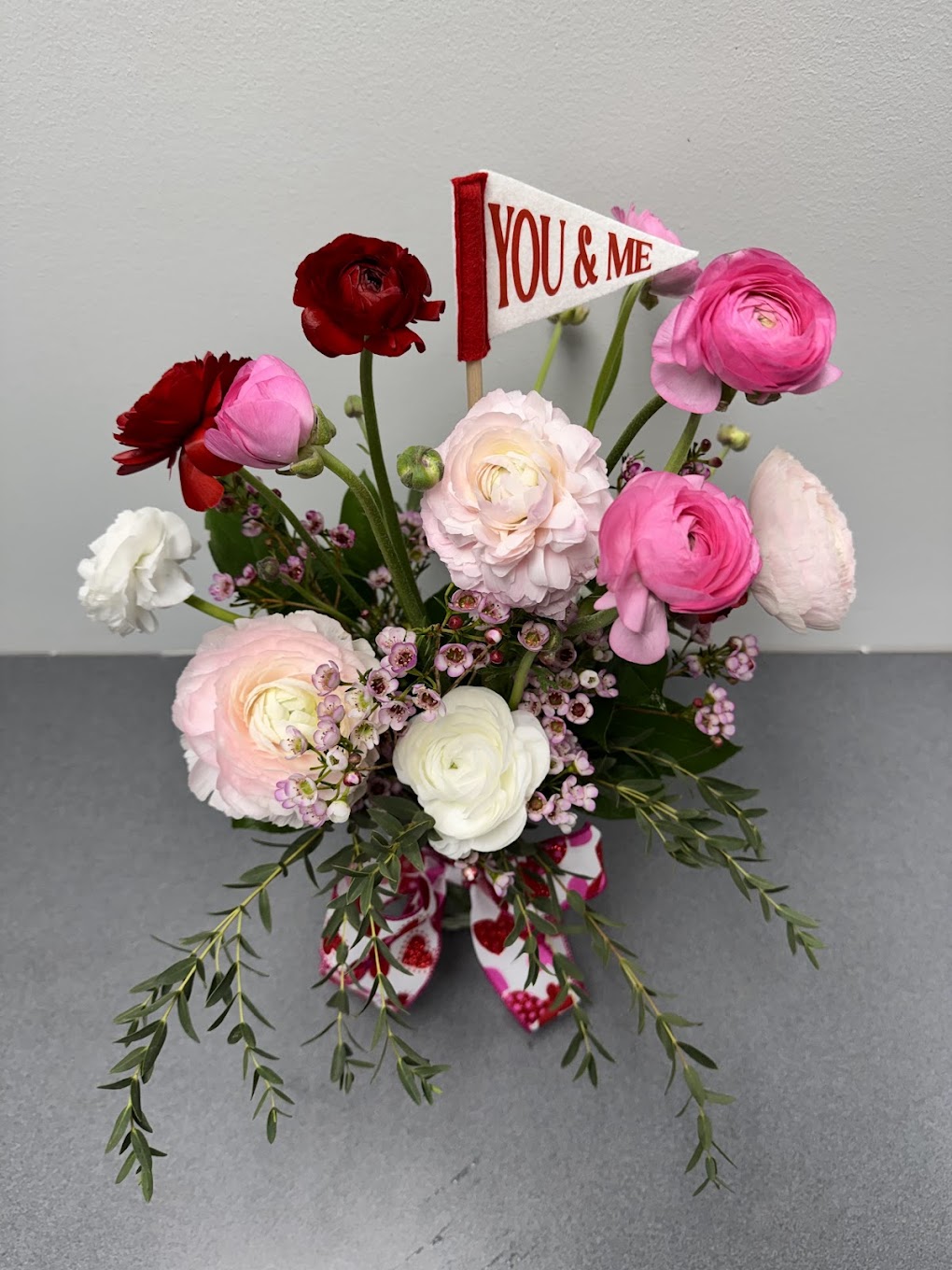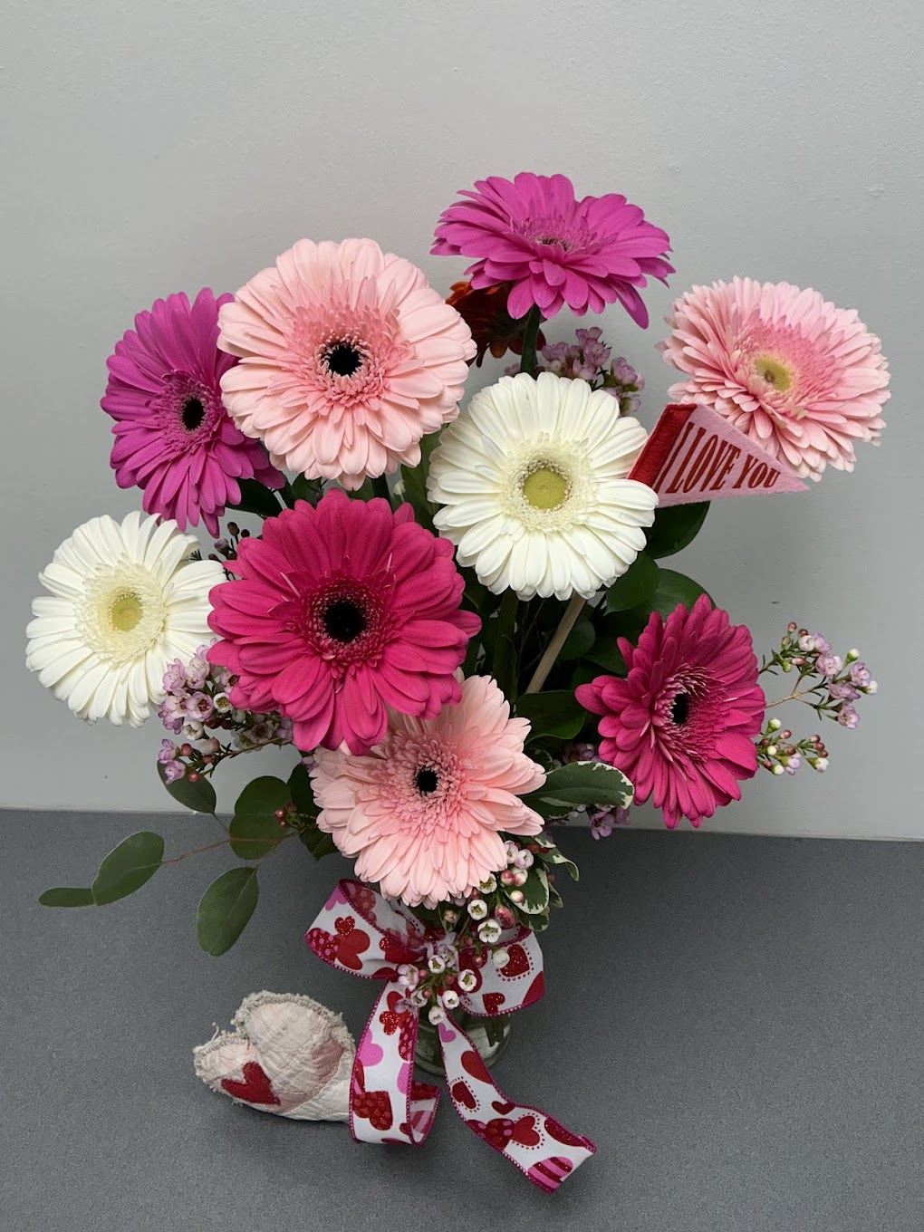 Roses not your thing? Never fear! We have a different dozen just for you. Choose either a dozen gregarious gerbera daisies, a dozen romantic ranunculas, a dozen elegant mini callas, or a dozen classic carnations. Arranged with fragrant foliage and a fun Valentine's Day pennant flag.