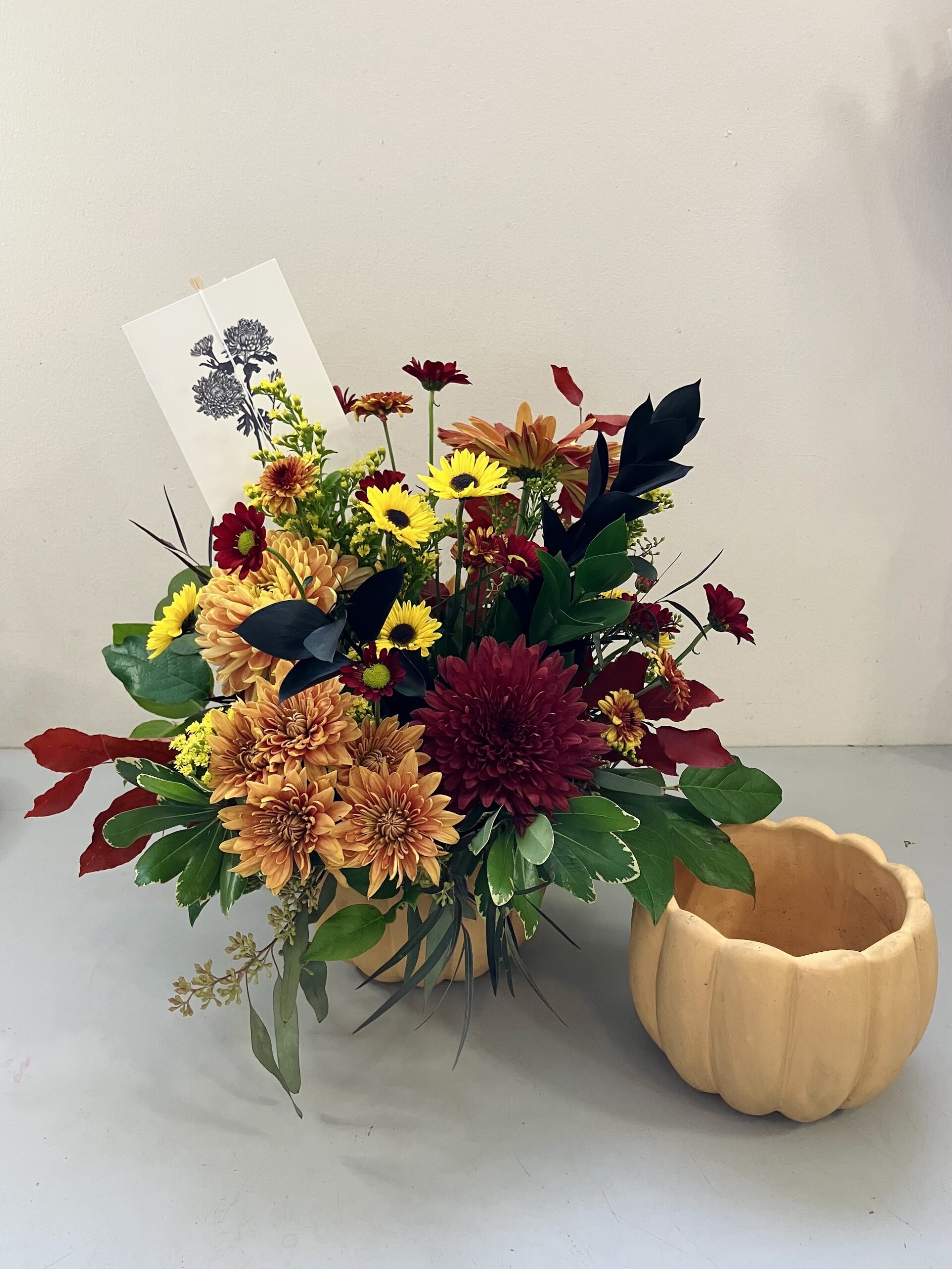 Mum's the word for November birthdays! Embrace the autumn spirit with this arrangement that features a mix of stunning chrysanthemums in fall colors nestled in a pumpkin container. It includes a locally made November birth flower card.