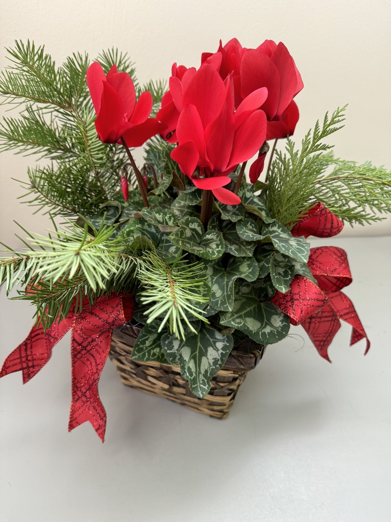Wichita grown cyclamen plant dressed for the season. A great corporate business gift or sympathy expression. Beautiful butterfly-like blooms dance above round leaves and fragrant evergreens. Same-day delivery available!