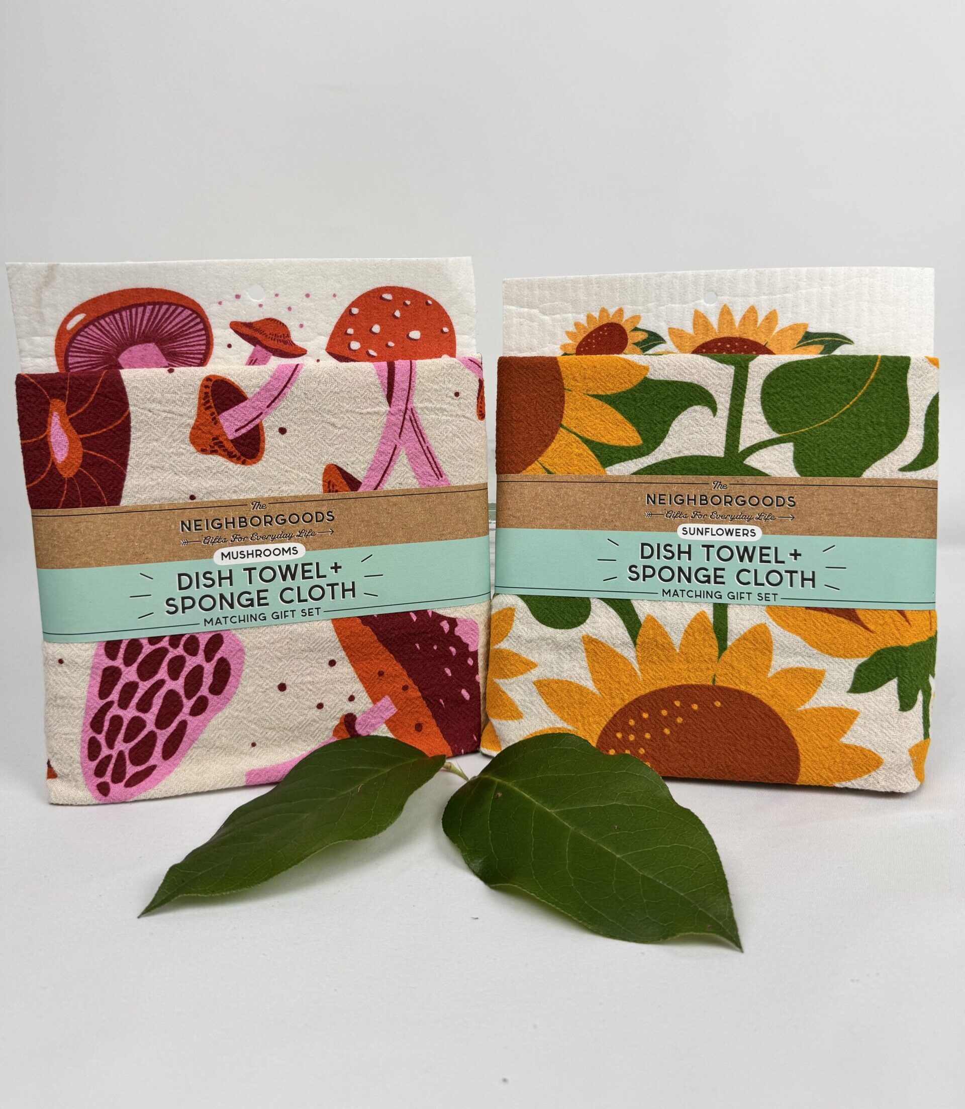 This dish towel and sponge cloth set makes for the perfect gift to add some fun! Choose from Mushrooms or Sunflowers.