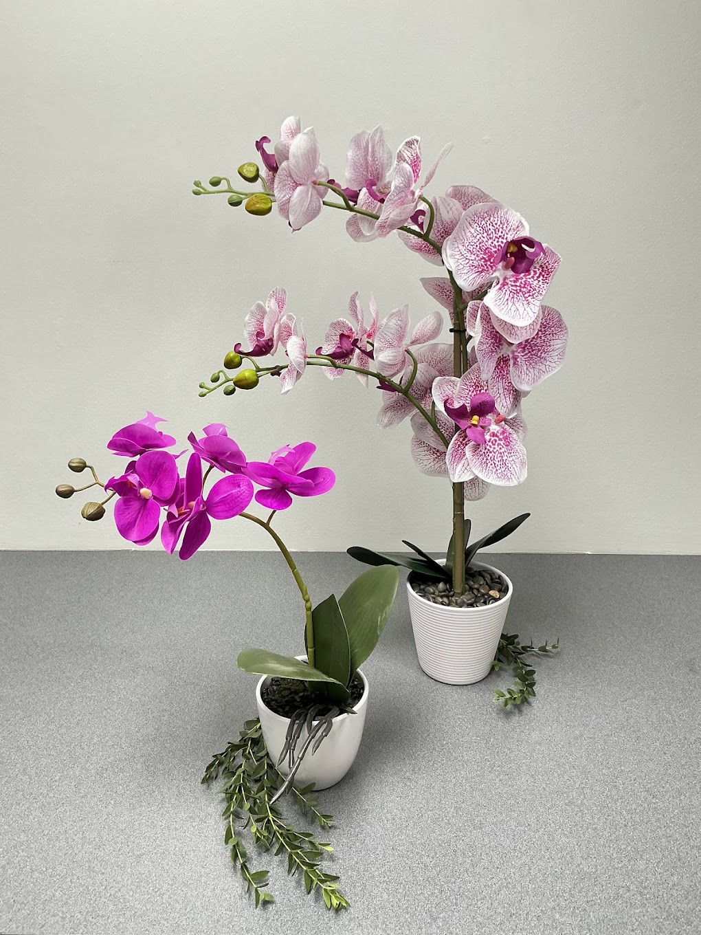 Bring lasting beauty to any space with this faux orchid plant in a decorative pot. Choose from 2 different options.