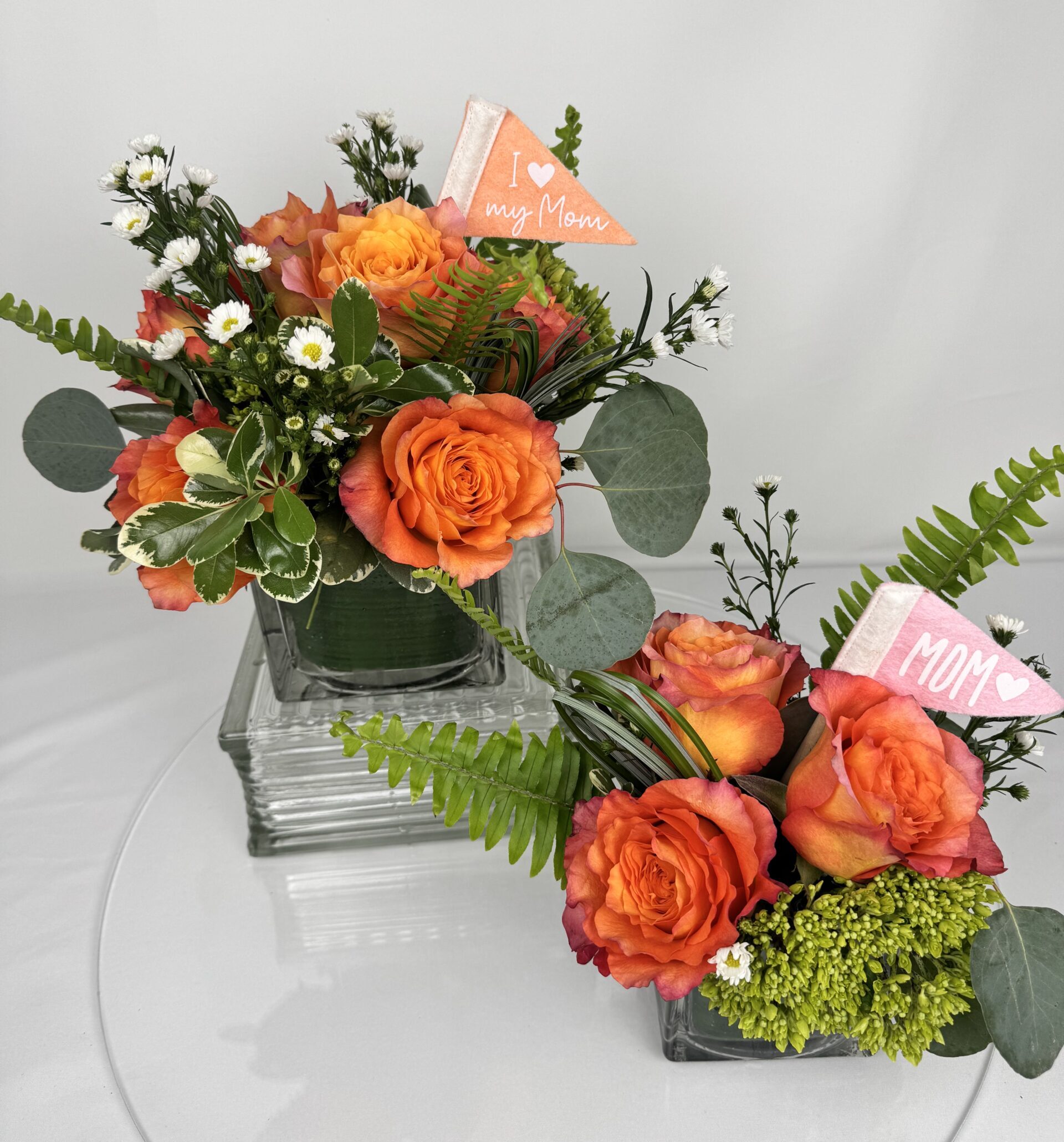 A vibrant coral-rose bouquet with adorable pennant flags is a perfectly thoughtful way to celebrate all the Mothers in your life. Available in 4 different sizes. (Petite and Classic shown)