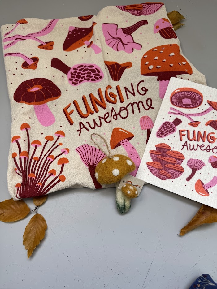 Mushroom dish towel and sponge set with a mushroom ornament.