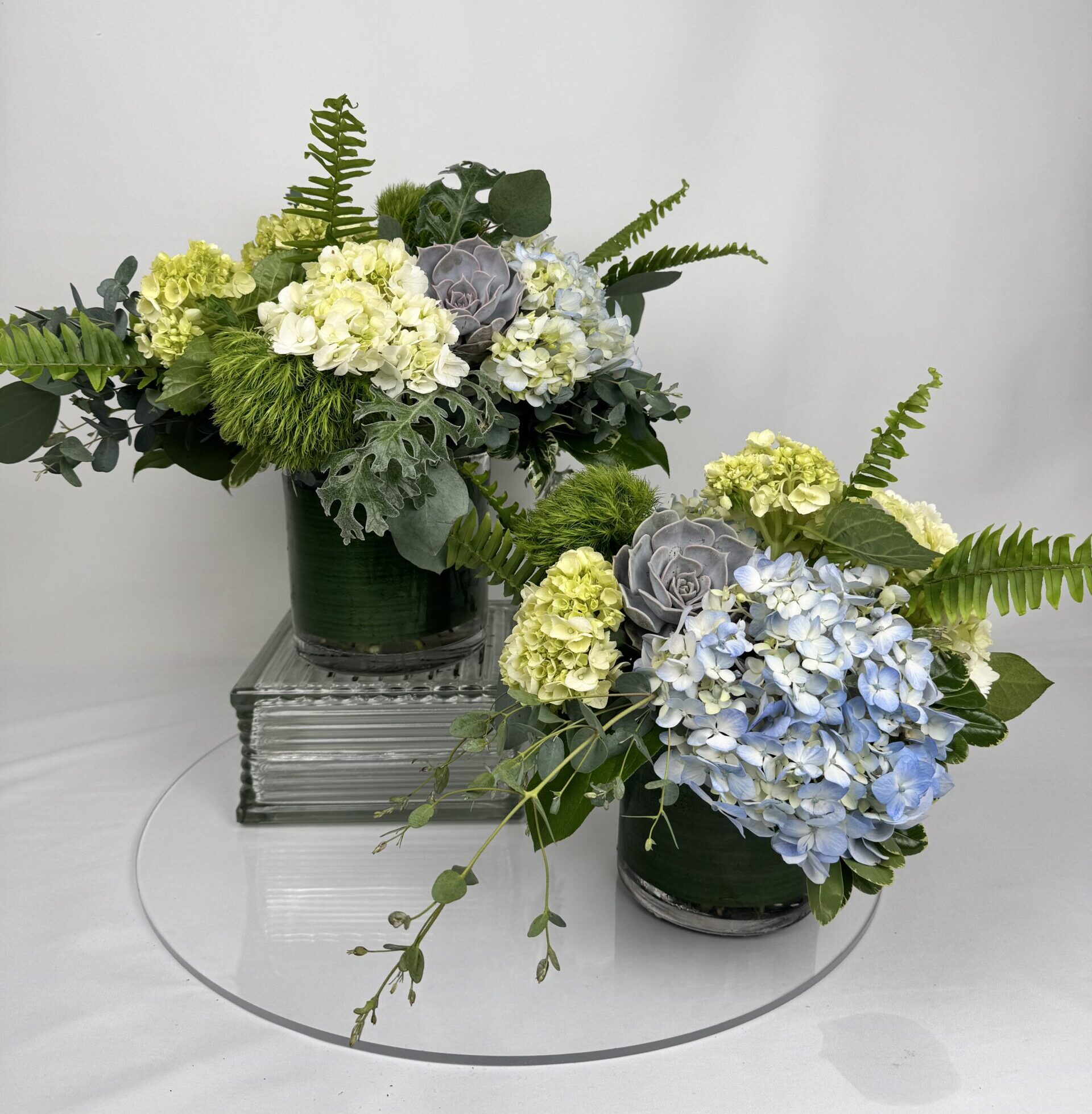 Cool-toned hydrangea arrangement with long-lasting succulents, hand-delivered in Wichita this Mother's Day! Available in 4 different sizes. (Petite and Classic shown)