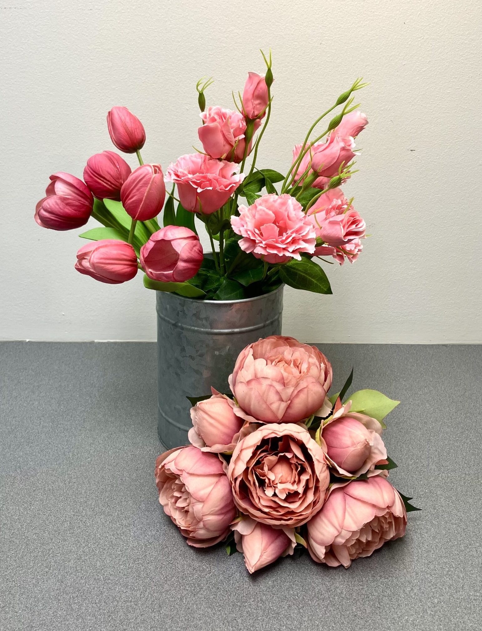 Classic real touch pink tulip bundle adds a pop of color to the season. Ruffly bubble gum pink lisianthus adds a touch of femininity to the season. Mauve peony bundle is a romantic touch this season.