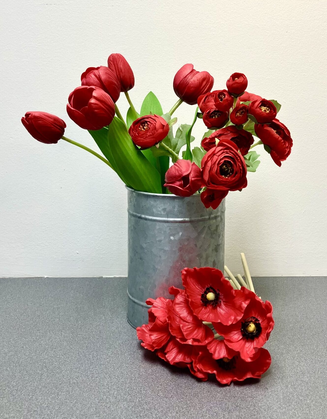 Classic real touch red tulip bundle adds a pop of color to the season. Red ranunculus bush with open blooms and buds is a vibrant spring accent. Real touch red poppies symbolize remembrance vibrantly.