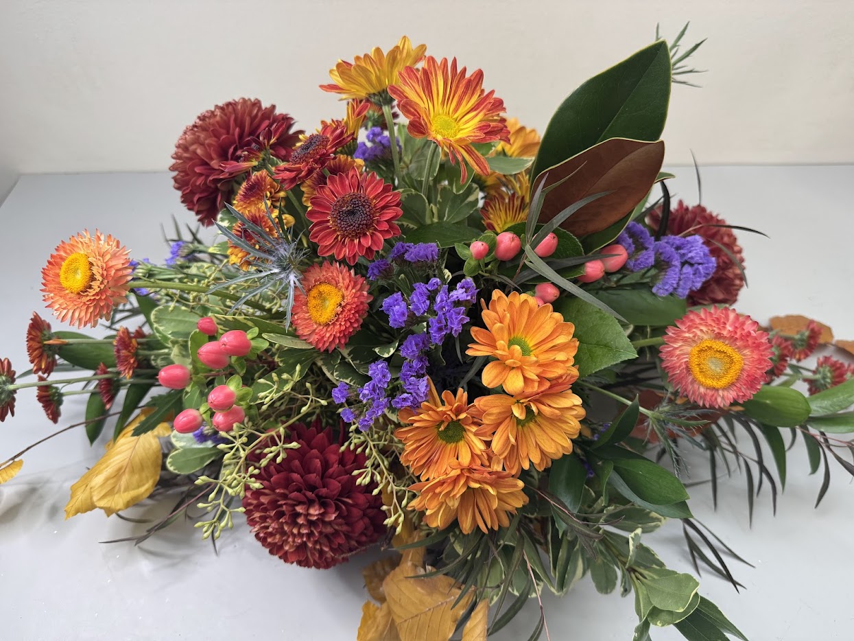A low, oval fresh flower centerpiece hand delivered in Wichita to send Thanksgiving well wishes.